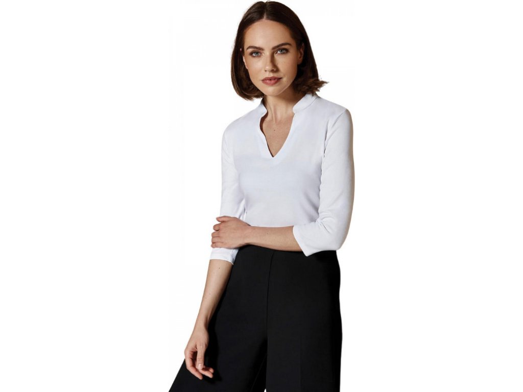 Klasický rovný střih s vsazenými rukávy a výstřihem do véčka lichotí většině postav a působí elegantně i v neformálním prostředí. Mandarínský límeček dodává modelu moderní vzhled a zároveň zajišťuje pohodlí kolem krku. Postranní švy zvyšují odolnost a prodlužují životnost halenky.