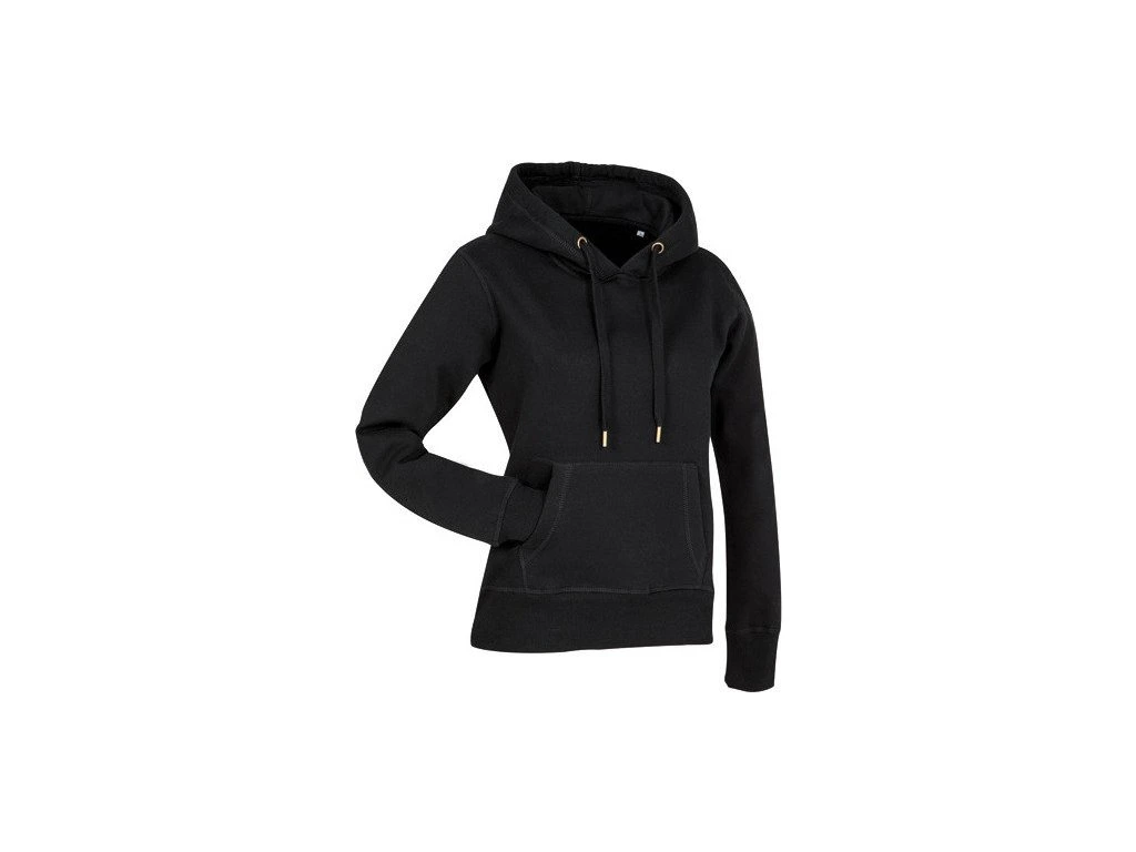 Dámská mikina s kapucí slušivého, mírně projmutého střihu s dlouhými vsazenými (set-in) rukávy. Ty jsou stejně jako spodní lem opatřené širokými žebrovanými manžetami s příměsí elastanu. Přednímu dílu vévodí velká klokaní kapsa. Lemem dvojité kapuce je protažená stahovací šňůrka odpovídající barvy. Kovová očka, kterými vychází šňůrka, ani zakončení samotných šňůrek neobsahují nikl. Mikina je šitá plochým stehem, ten zajistí dostatečnou pevnost i zajímavý design. Díky postranním švům dobře sedí a budete se v ní cítit pohodlně, ať už v pohybu nebo při odpočinku.