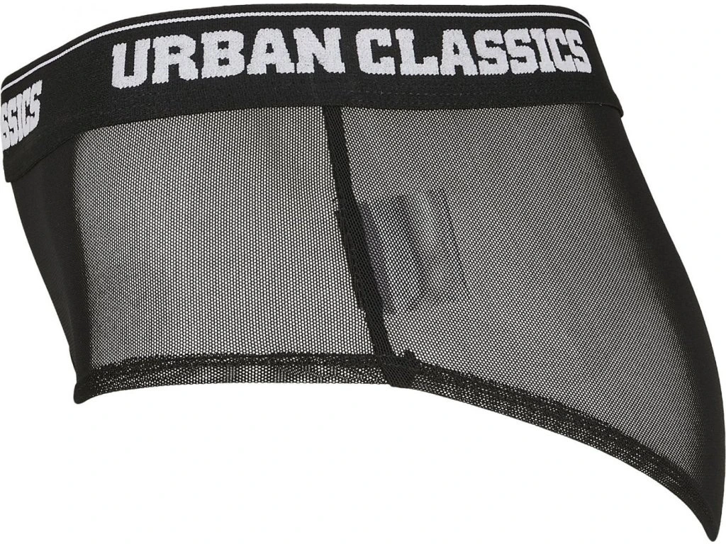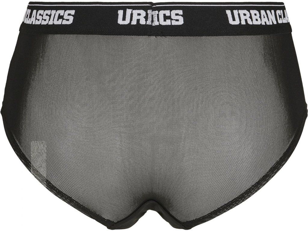 Sexy a zároveň sportovní: tyto žhavé kalhotky vám nabízejí průhledný síťovaný materiál a sportovní střih a také přiléhavý elastický pas s obvodovým nápisem Urban Classics jako vizuální vyjádření. Pohodlný střih s mírně zkosenými výřezy nohavic se dokonale přizpůsobí vaší postavě. Trendy kalhotky pro každý den.