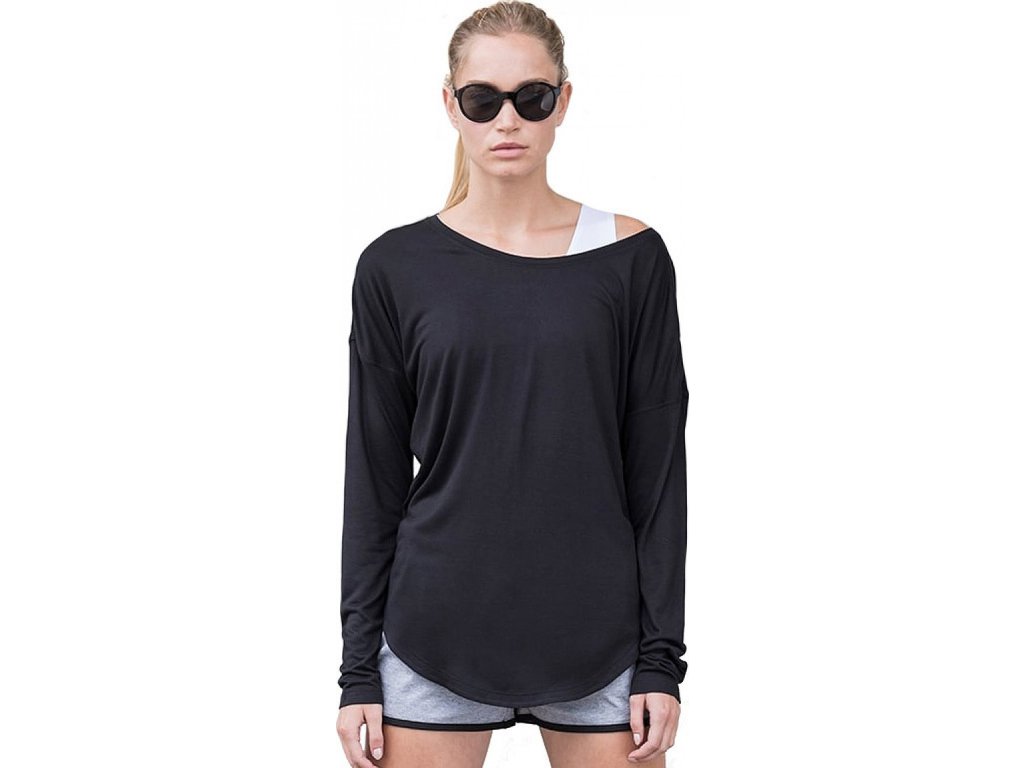 Tričko s dlouhými „spadlými“ rukávy volného střihu, v němž se budete cítit pohodlně, a taktně zakryje případné nedostatky na vaší figuře. Široký výstřih umožňuje nošení s odhaleným ramenem, což přitahuje mužské pohledy. Tričko se díky oblému spodnímu lemu nosí navrch přes džíny, sukni či šortky, zadní strana je o něco prodloužená. Komfort zajistí ploché švy na ramenou, bocích i středu zad. Pro dosažení tvarové stálosti jsou ramenní švy vyztužené elastanem, průkrčník, rukávy a postranní švy zdvojené.