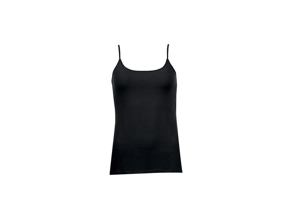 Tílko úzkého střihu, ochotně se přizpůsobí tvarům vaší postavy. Kulatý výstřih se zajímavým lemováním přechází do tenkých špagetových ramínek. Zadní díl je střižený rovně. Výsledkem je slušivý, velmi ženský model, vhodný k sukni, šortkám i džínům.