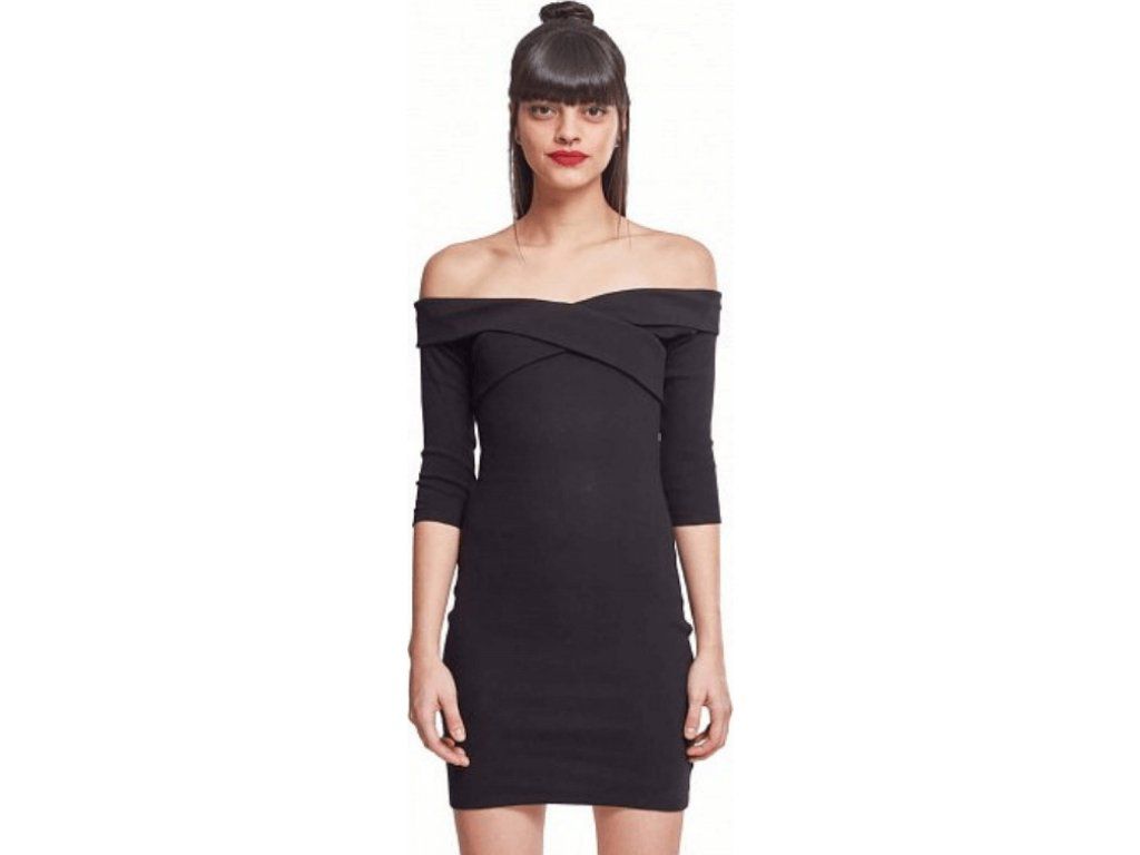 Šaty jsou kratší délky. Vytvoří perfektní postavu, protože dokonale přiléhá na tělo. Výstřih je typu carmen, tzn. spadlá ramena, který je velmi oblíbený. Rukávy jsou ¾ délky, což je zajímavým prvkem celého designu. Nesmíme opomenout také zkřížení šatů v oblasti dekoltu, které opticky dekolt zvětší.