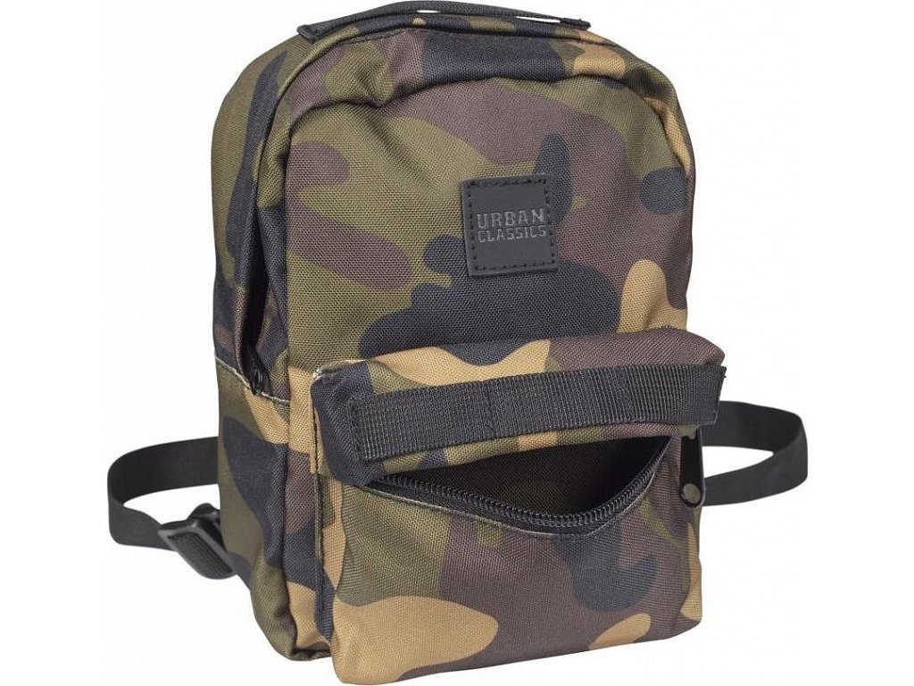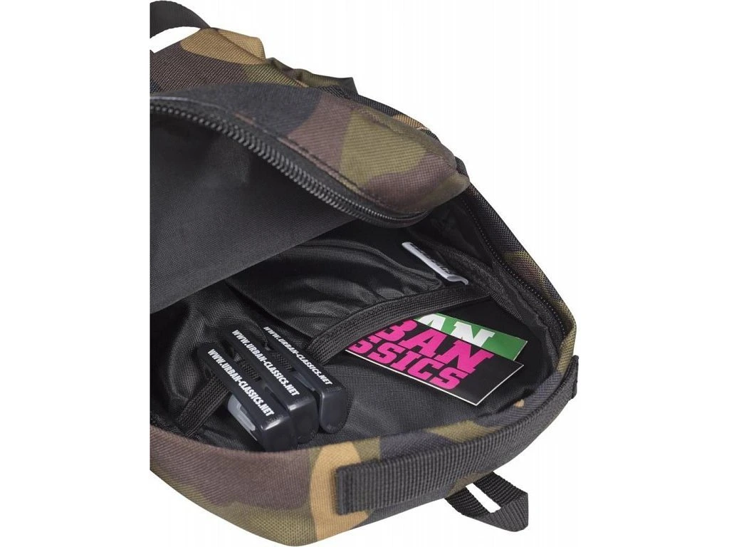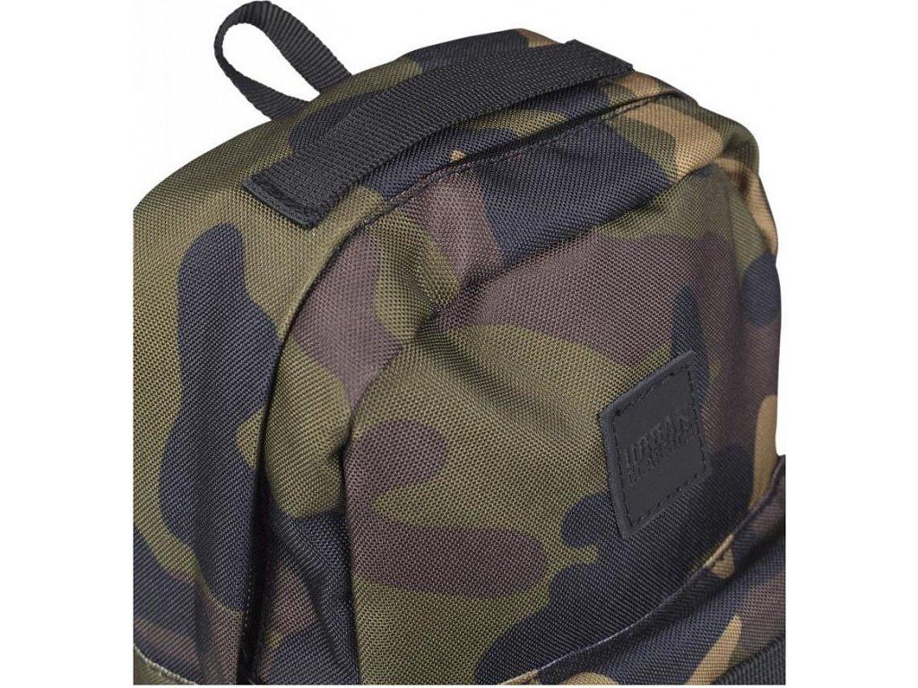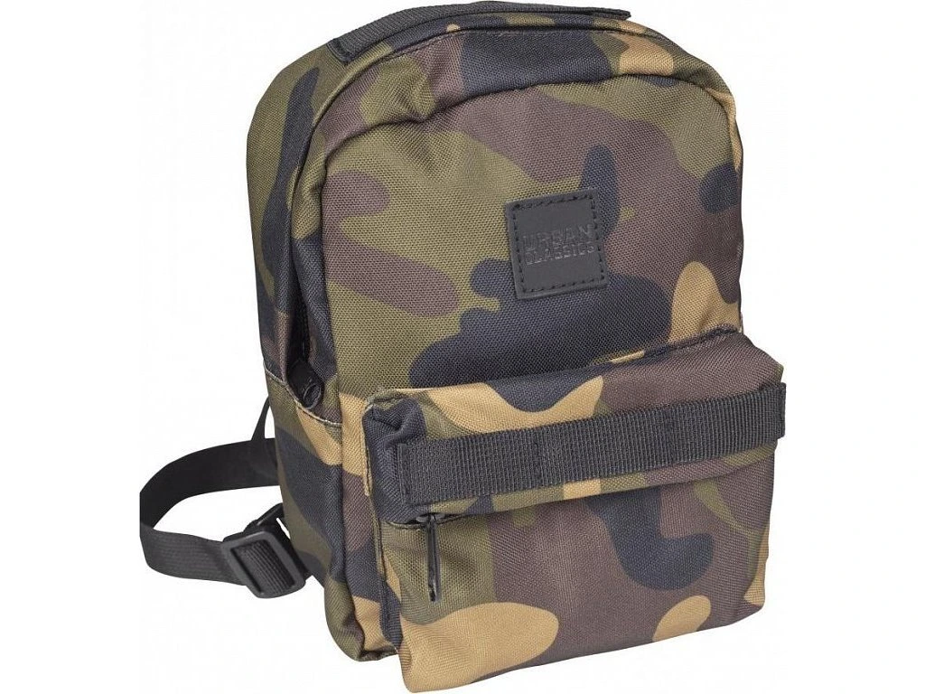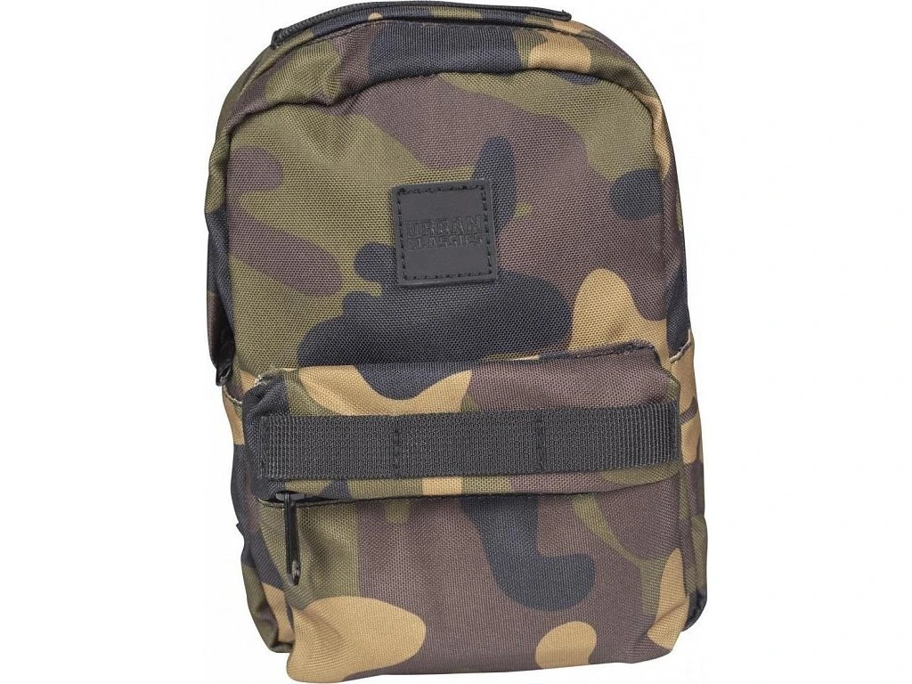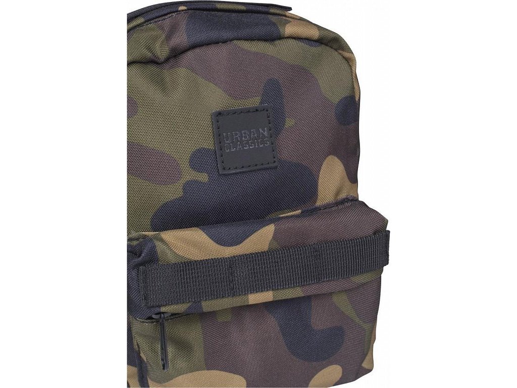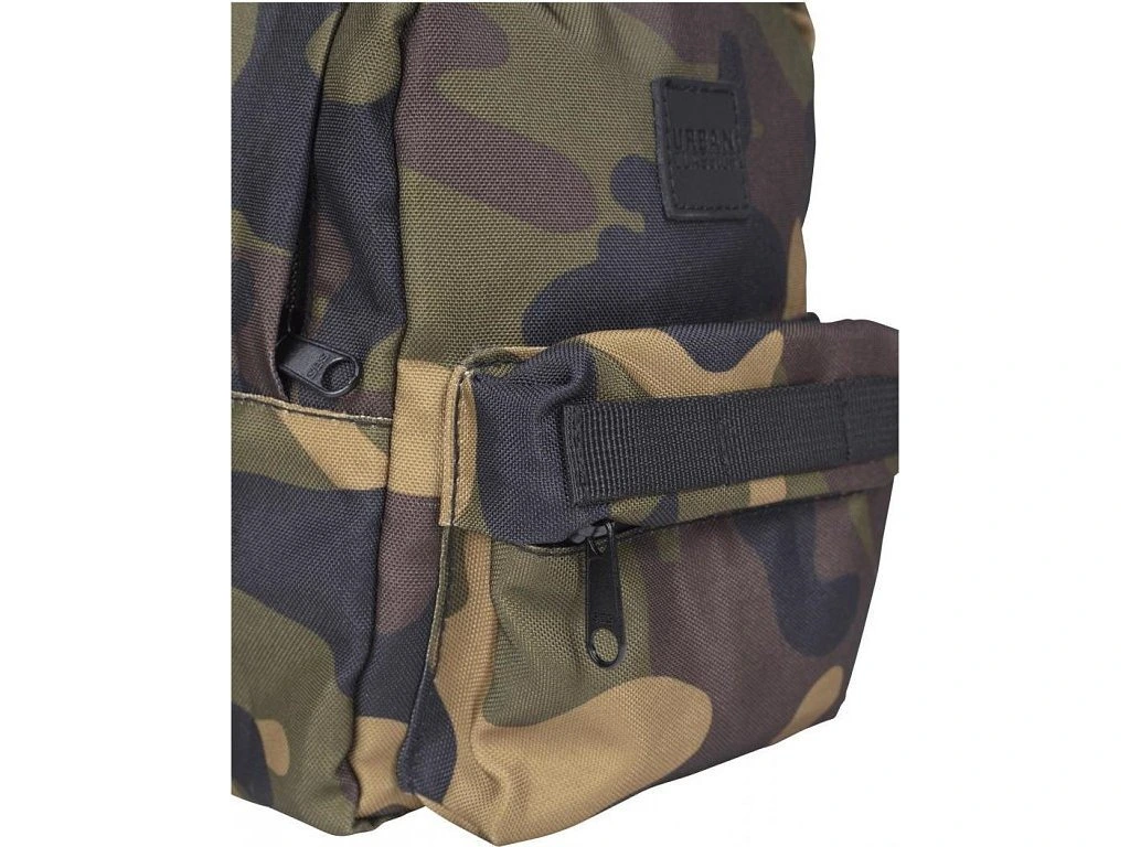 Mini batůžek lze prát v pračce na 40°. Jedinečný design kamuflážového vzoru doplňuje koženkové logo značky Urban Classics na přední části batohu.